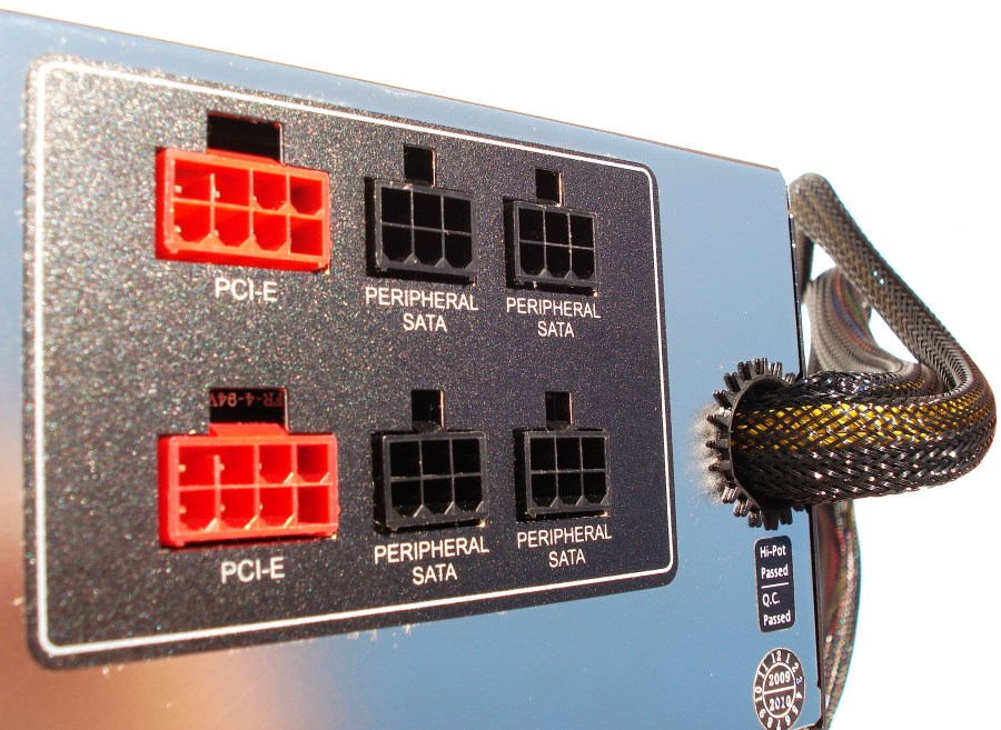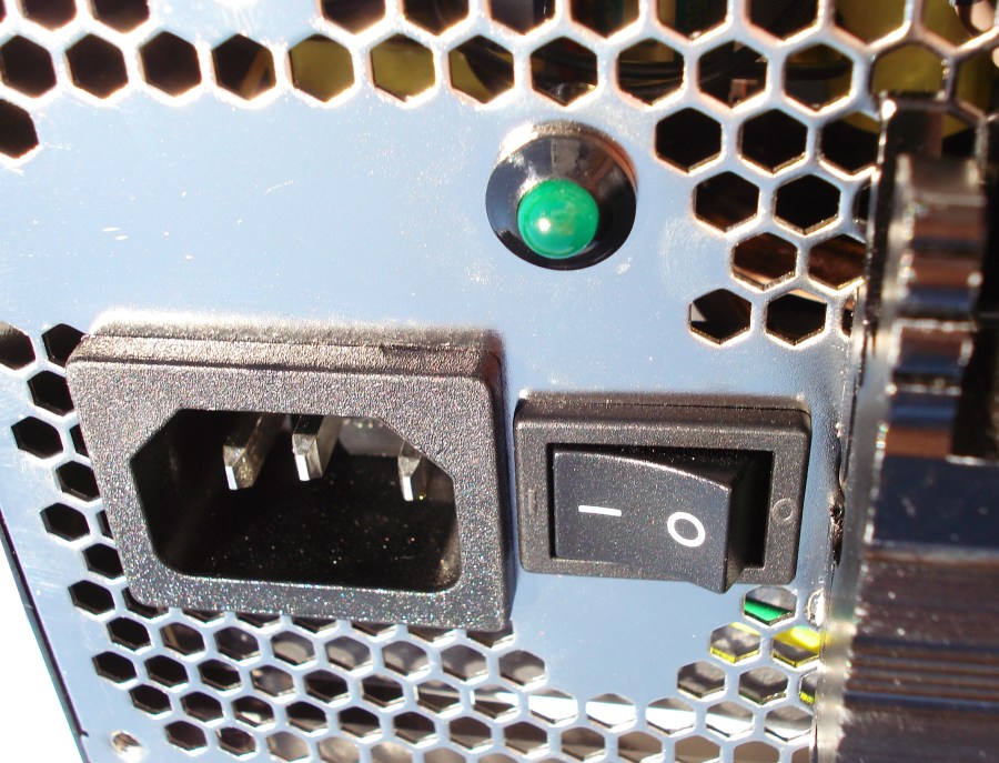 Estos tres elementos, son lo mínimo que toda fuente de alimentación debería tener en su cara trasera. El conector de Corriente Alterna es el típico que todos conocemos, esta vez bien fijado por la cara interior. El led verde nos indica cuando la fuente está encendida, permaneciendo apagado aún estando conectada la fuente a nuestra toma de corriente. El interruptor también está firmemente fijado por dentro, y no es para menos, ya que es una parte donde solemos meter los dedos. Si nos fijamos un poco, vemos que la zona de estos tres elementos está reforzada, ya que se eliminan las perforaciones, haciendo más robusto el perímetro de estos 3 elementos.