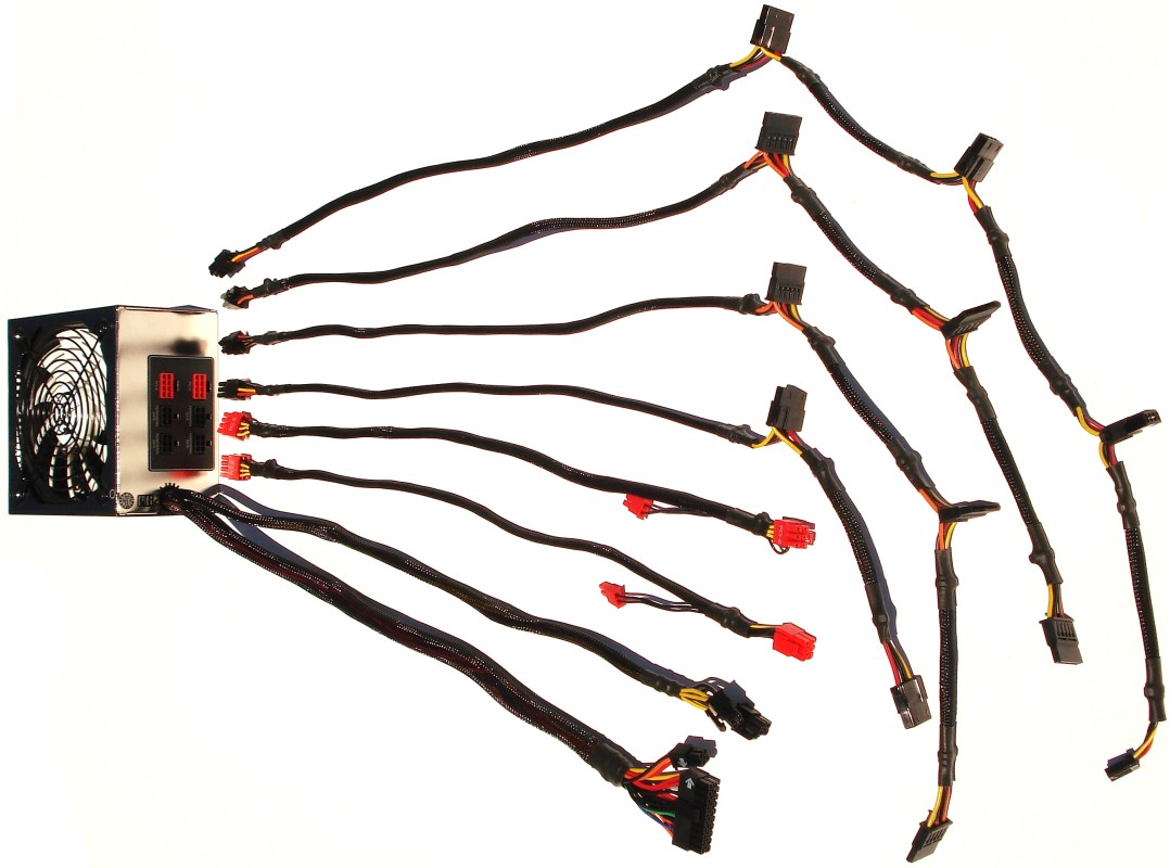 Viendo sus conectores tenemos suficiente para conectar hasta 2 tarjetas gráficas en SLI o Crosffire de gama media-alta, con conector de 6 u 8 pines cada una, no siendo para nada aconsejable abusar en este aspecto. Por lo demás, podemos conectar hasta 6 discos duros SATA y 5 dispositivos periféricos, junto con un dispositivo con molex formato floppy. Para una fuente de 600W reales, está francamente bien y bastante equilibrado en conexiones.