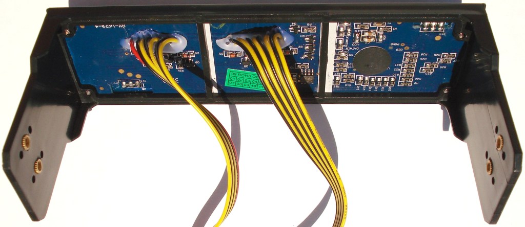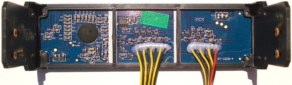 Si miramos su parte trasera, vemos su placa electrónica, muy bien ensamblada. De ella salen los dos ramales de cables, ramal 2 (centro) y ramal 1 (derecha). Éste último, con los 3 cables de alimentación (rojo +5V, amarillo + 12V y negro neutro).