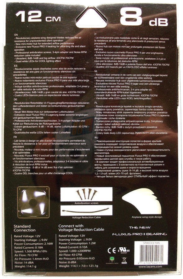 A parte, se limita a informarnos de sus características más importantes, ya nombradas en la página 2 y en 8 idiomas, incluido el español. A parte tenemos 3 dibujos que nos muestran al ventilador en plena acción luciendo sus leds, los 4 pads antivibracines y el cable reductor de voltaje incluidos y el diseño aerodinámico de un aspa del ventilador. Abajo en la derecha se puede ver el propio código de barras.