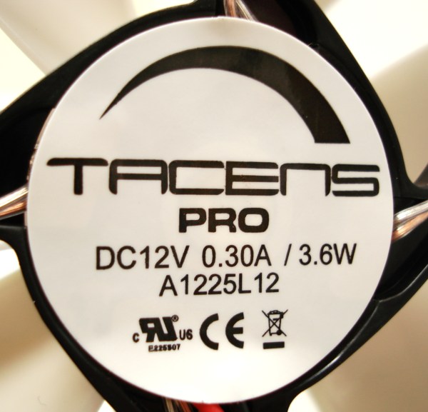 Esta pegatina es la que suele tapar el acceso al desarme del rotor. De despegarla podríamos desmontar el ventilador. TACENS PRO es lo más llamativo. Además incluye parte de sus especificaciones técnicas. Su potencia de 3.6W es lo que más llama la atención. Abajo nos muestran varios símbolos de cumplimiento de este ventilador.