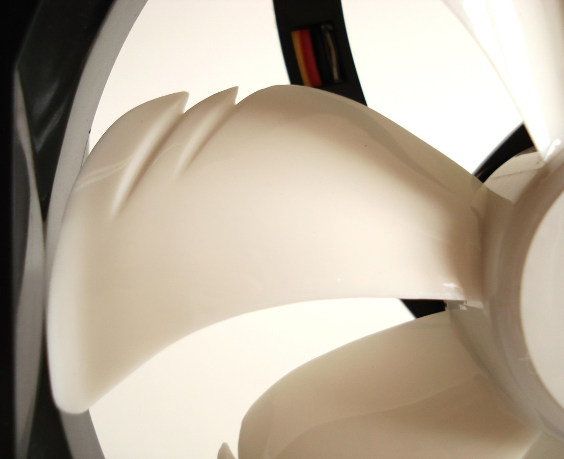 Su base es cuadrada, común a la mayoría de ventiladores, y sus aspas tienen un diseño muy peculiar. Se ha querido imitar a las aspas de una avión, haciéndolas más aerodinámicas y jugando más con las curvas. Todas las aspas tienen 2 surcos dentados que ayudan a mejorar el caudal de aire.