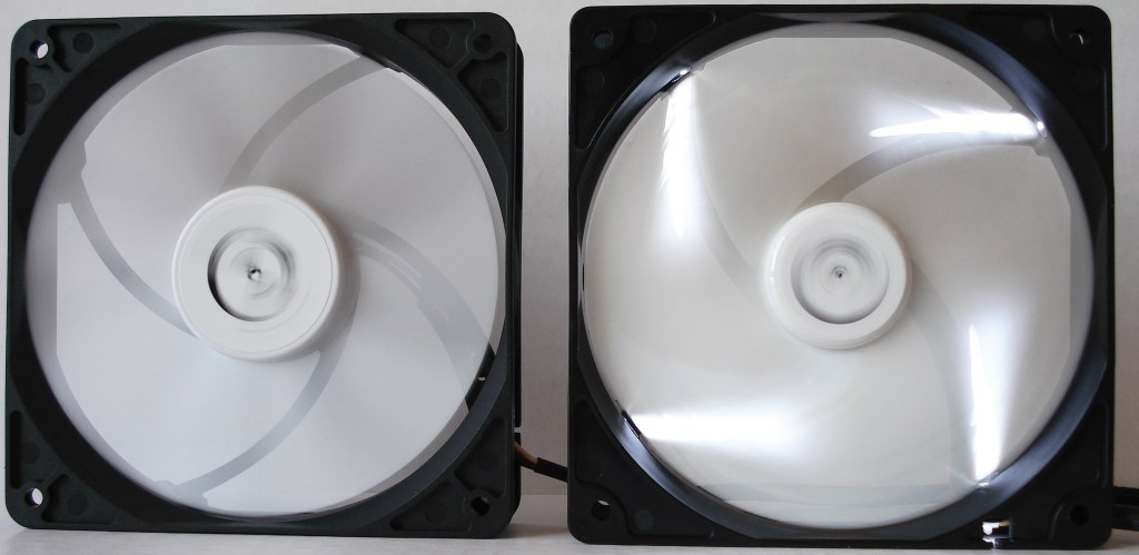 A la izquierda tenemos funcionando el AURA PRO, y a la derecha el SPIRO ICE con sus leds en acción. La prueba empieza con una tensión de 12V para cada uno de los ventiladores. En unos instantes cambiamos ambas tensiones a 5V. Las aspas empiezan a rotar más lentas y con ellas se genera un efecto divertido. Es evidente que el ventilador SPIRO ICE luce mejor por su toque moding, al ser poseedor de 4 leds blancos encarados hacia las aspas. Seguidamente, subimos al mismo tiempo las dos tensiones a 7V, y se vuelve a generar otro efecto rotor de las aspas, ya que hemos aumentado la velocidad de las mismas. Finalmente, volvemos a subir ambas tensiones a 12V, hasta que terminamos apagando el equipo. Con ello vemos como ambos ventiladores se paran, siendo algo más lento en el proceso el SPIRO ICE, ya que rotaba a más velocidad.