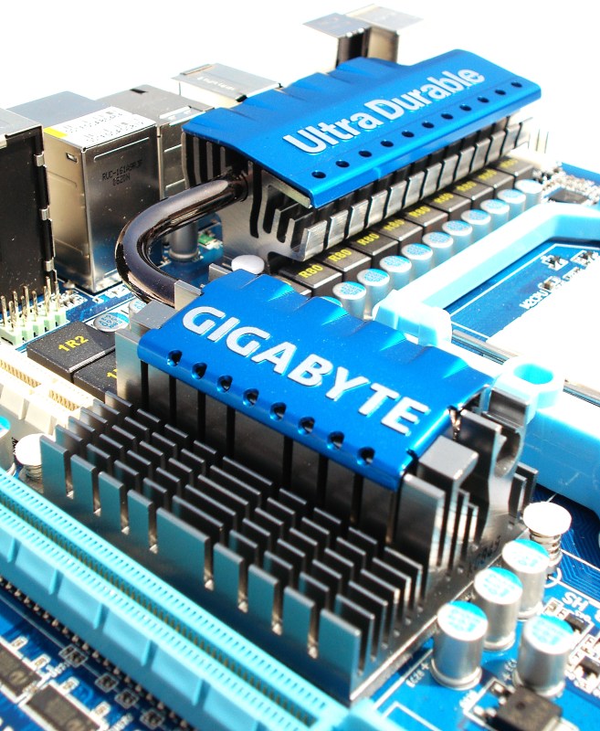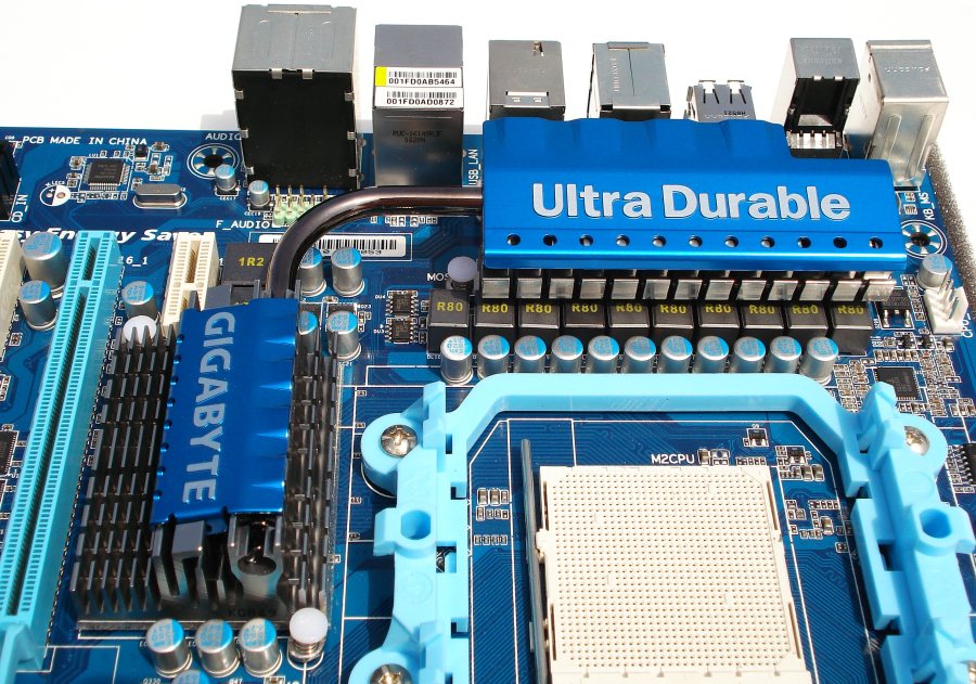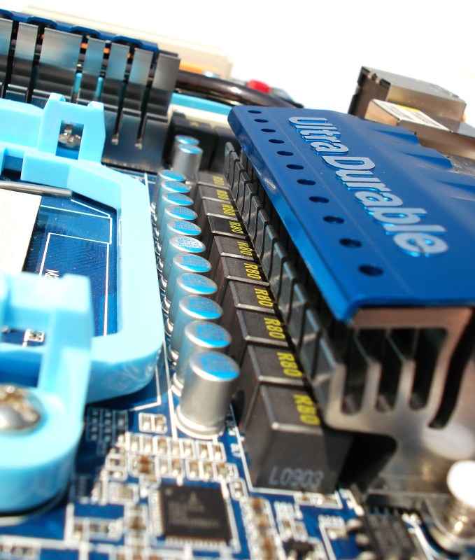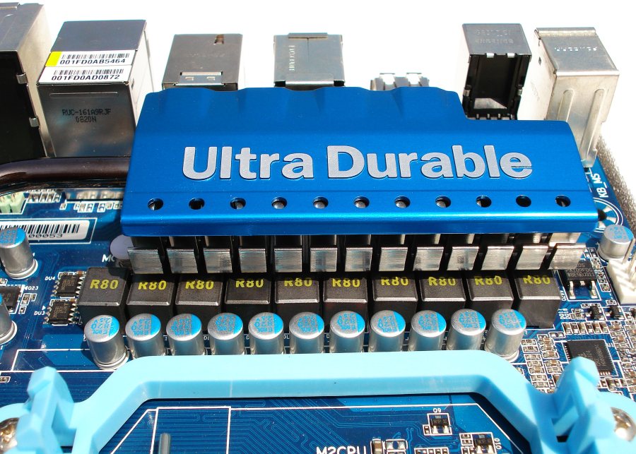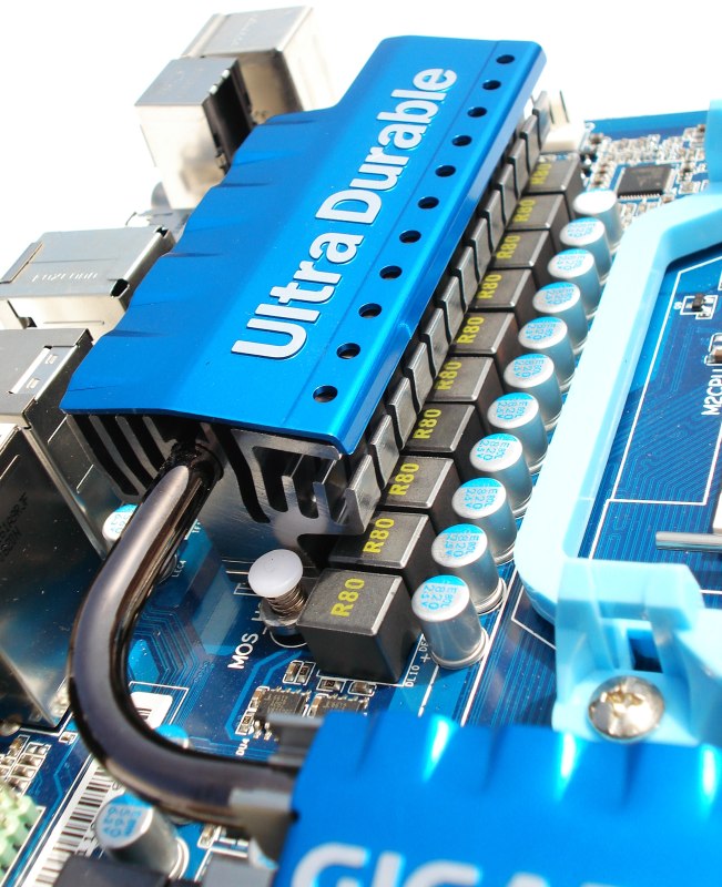 Y sobre los Mosfets aparece el término «Ultra Durable» haciendo referencia a la tecnología patentada por GIGABYTE Ultra Durable 3, que combina 3 tipos de materiales de elevada calidad: Condensadores sólidos japoneses, Mosfets de menor RDS(on) y Fases con núcleos de ferrita, junto con el diseño de la placa electrónica tipo 2 OZ Cooper, con diferentes capas para mejorar la eficiencia energética. De manera que el conjunto consigue emitir menor temperatura, y con ello mayor eficiencia, ahorrando en coste por consumo eléctrico.