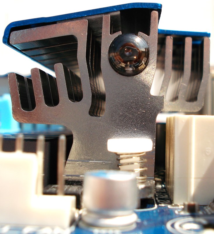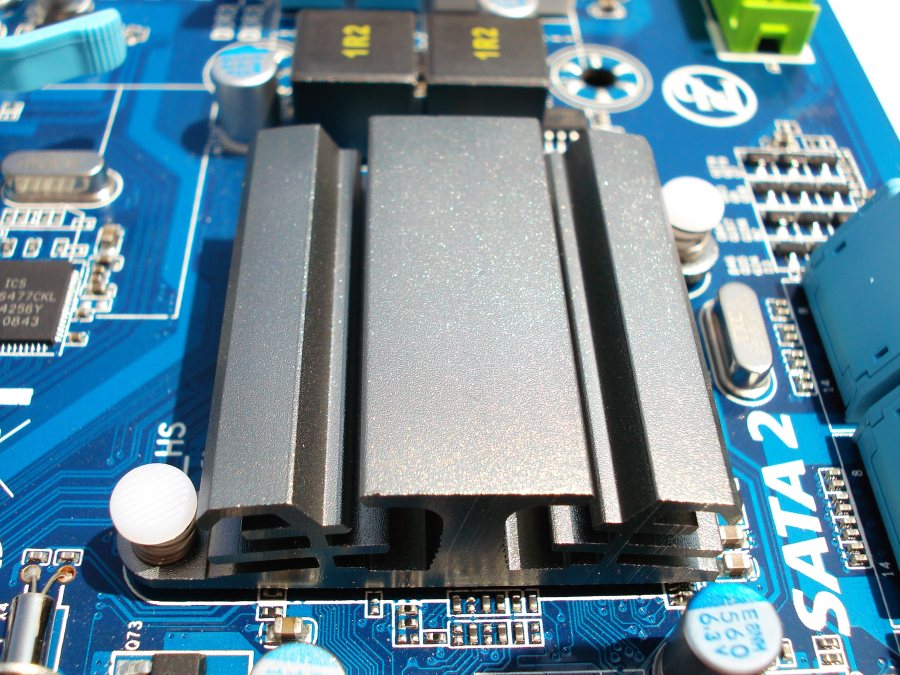Y ya abandonando el Northbridge y la zona del socket saltamos al Southbridge. Este es disipado por otro cuerpo de aleación de menor tamaño, fijado en diagonal por otros dos anclajes de plástico con sendos muelles.