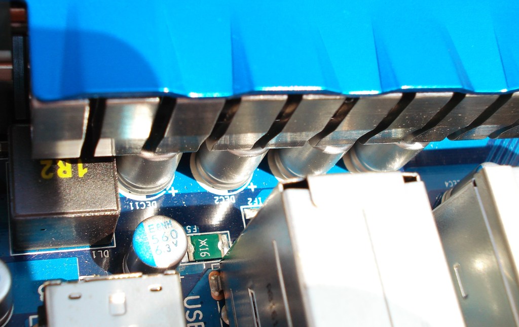 Esta fotografía es excelente para explicar las 3 lineas de componentes electrónicos que se disponen en el lateral del Socket. En primer lugar tenemos una hilera de 11 condensadores sólidos japoneses. En la hilera central tenemos las 8+2 fases con núcleos de ferrita. En la hilera tapada por el disipador tenemos hasta 5 Mosfets con baja RDS(on). El disipador queda a unos 2mm sobre las fases.