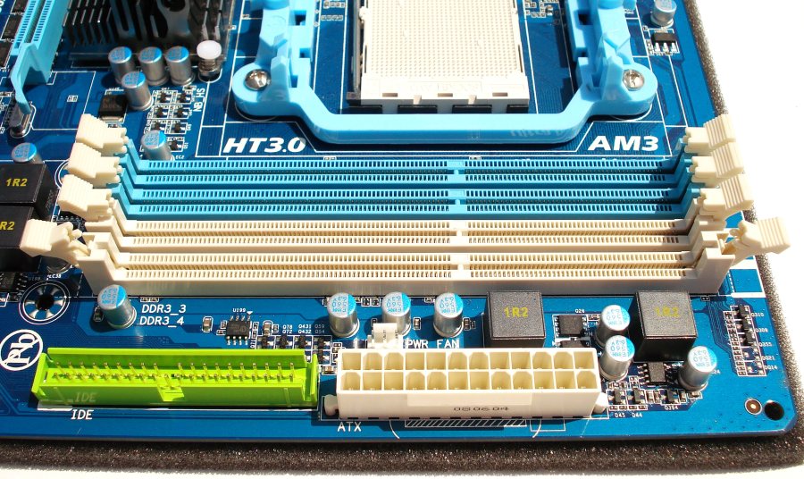 Tal como hemos mencionado antes, la GA-MA790XT-UD4P es compatible con memoria RAM DDR3 de hasta 1666 practicando OC. Podremos instalar hasta 16GB, aunque los más común y a lo máximo que se aspira es a instalar 4x2GB, en total 8GB en Dual Channel. Para que tal función esté instalada se emparejarán los módulos de memoria en los slots por colores, 2 en los azules o 2 en los blancos.