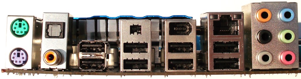 El panel trasero no se queda atrás, ya que tenemos prácticamente de todo: 2 conectores PS/2 para teclado y ratón, 2 conectores Óptico y Coaxial para S/PDIF Out, hasta 8 conectores USB2.0/1.1, 2 puertos IEEE 1394a de diferente formato y el puerto LAN RJ-45. Por último, tenemos el panel de conectores tipo jack 3.5 hembra para conectar hasta 7.1 canales de audio independientes, junto con un micrófono y una entrada de audio estéreo. Quizá echamos de menos un puerto e-SATA y tal vez empezamos a pensar que sobren los puertos PS/2.