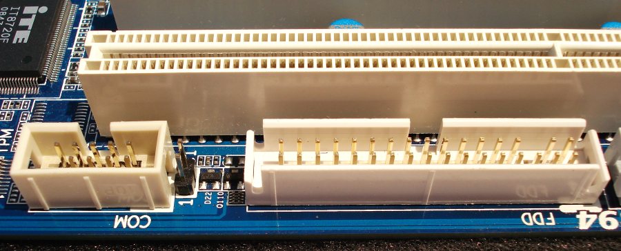 En cambio, también tenemos el Conector COM y el conector Floppy que tanto ya aborrecemos. De hecho hasta los propios fabricantes lo marginan colocándolo en la parte inferior de la placa base, y que a veces incluso resulta imposible de conectar por la lejanía al dispositivo de disquetera. No me cansaré de decir que la disquetera debe desaparecer. Está obligada a ello.