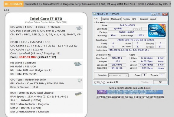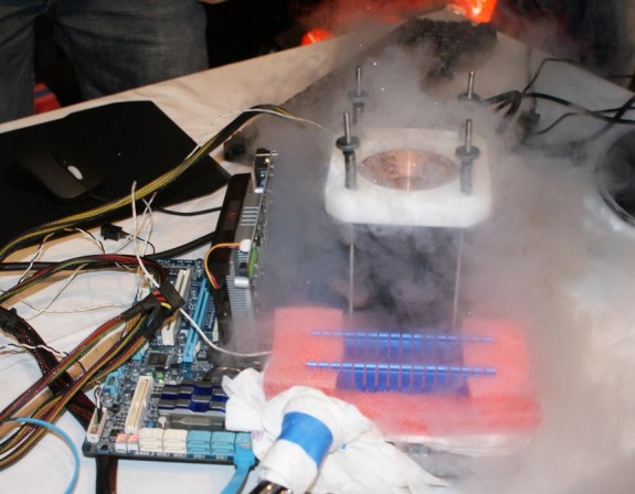 No obstante, también influye el resto del sistema para lograr este récord, que en este caso hicieron uso de una placa base Gigabyte GA-P55-UD6, un procesador Intel Core i7-870, una tarjeta gráfica ATI Radeon HD 5670, una unidad de estado sólido Kingston de 512GB y, por supuesto, nitrógeno líquido para la refrigeración de la CPU, la que alcanzó los 4347.39 MHz.