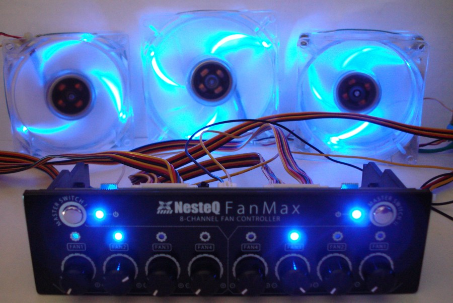 Para hacer estas pruebas hemos optado por medir por cada canal la tensión mínima y máxima de 6 y 12V respectivamente, tomando dos medidas, con un ventilador conectado y sin él. El ventilador empleado es uno de 9×9 cm de la marca Thermaltake, modelo TT-9025T, de alto rendimiento.