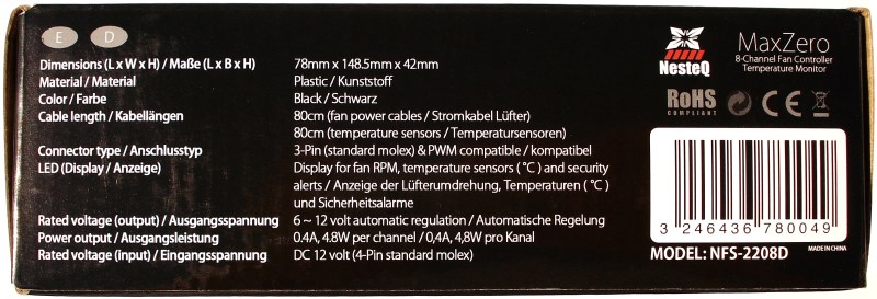 Siguiendo con los dos idiomas, inglés y alemán, NESTEQ nos facilita las especificaciones técnicas del producto. El modelo es el NFS-2208D, situado debajo del código de barras de compra. Cumple con las especificaciones RoHS, posee el marcado CE, es reciclable y no debe ser depositado en la basura.