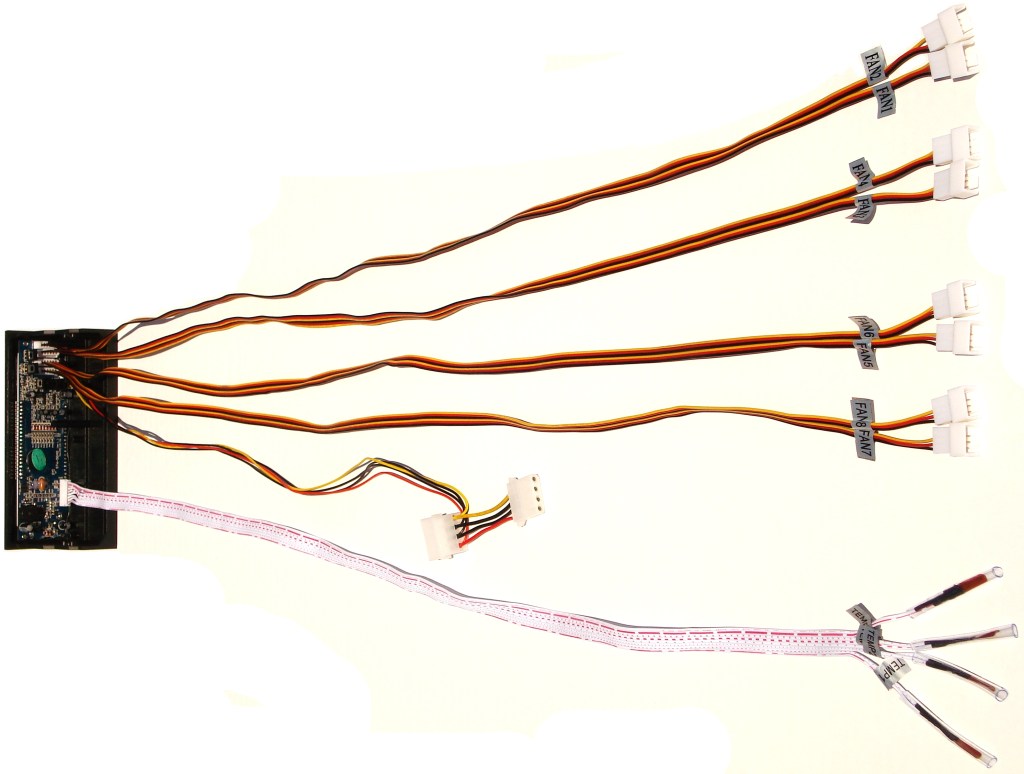 - Ramal 4 de alimentación de salida. Proporciona 2 canales regulable de 0 a 12 voltios de corriente continua, con los modos 0, 5, 7, y 12V. Posee 2 molex de 3 pines, cada uno unido a un cableado de 3 cables, amarillo, rojo y negro. Cada uno viene bien etiquetado con el nombre FAN X, siendo X el número del canal del 7 al 8.