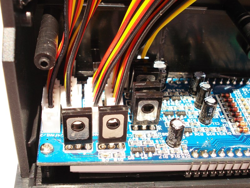 - Ramal 1 de alimentación de salida. Proporciona 2 canales regulable de 0 a 12 voltios de corriente continua, con los modos 0, 5, 7, y 12V. Posee 2 molex de 3 pines, cada uno unido a un cableado de 3 cables, amarillo, rojo y negro. Cada uno viene bien etiquetado con el nombre FAN X, siendo X el número del canal del 1 al 2.