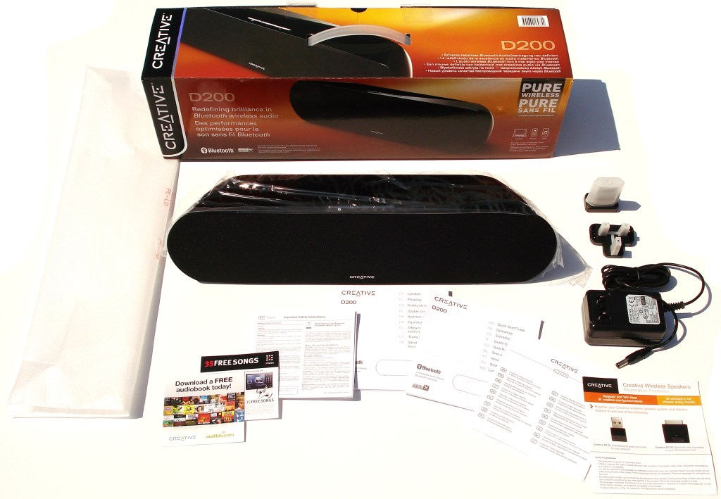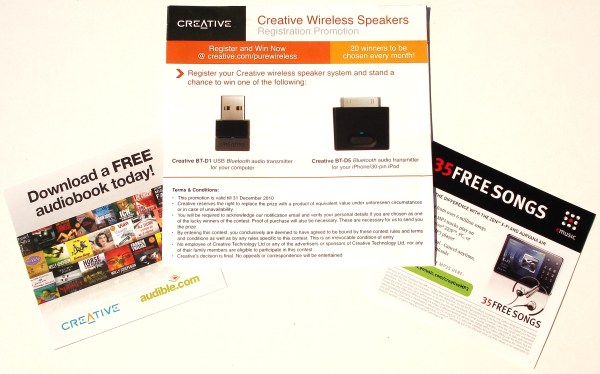 En las fotografías de exposición anteriores podemos observar todos los componentes del producto D200. A parte del transformador y sus dos enchufes intercambiables ya vistos, tenemos un surtido de manuales y de ofertas de descarga de audiobooks y audio en MP3. Esto es un detalle que se agradece bastante. CREATIVE ha pensado que nos vendría bien descargar este tipo de contenido y poderlo disfrutar con nuestra caja acústica D200. Veamos estos folletos de descarga y manuales, y posteriormente nos centraremos en el punto fuerte del producto, la caja acústica activa…