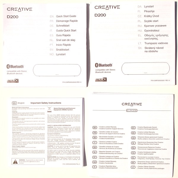 CREATIVE nos informa debidamente con un surtido de manuales para que tengamos las cosas bien claras. Tenemos dos manuales con diferentes idiomas (hasta un total de 18 idiomas) para explicar las instrucciones de uso e instalación del D200. A parte, tenemos otro manual donde nos indica todo lo relacionado al correcto reciclaje del producto. Para finalizar, y no podía ser menos, CREATIVE dedica un manual entero a la garantía limitada del producto, que recordamos que es de 1 año. Ambos también en múltiples idiomas.
