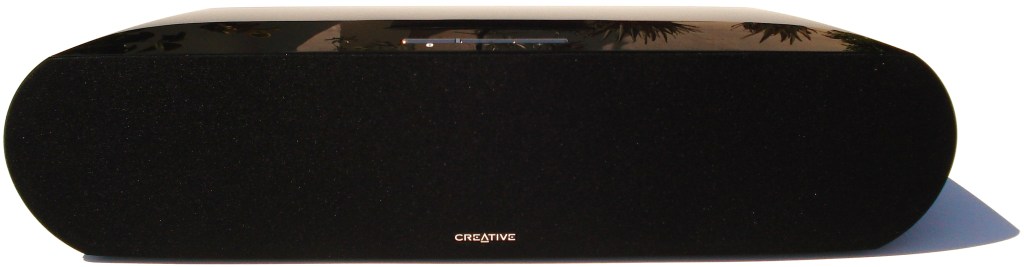 Aquí podemos apreciar bien como CREATIVE mezcla el paso del plástico negro brillo con la tela negra del frontal. Está exquisitamente ajustado. Está perfecto. En el frontal tenemos el bonito detalle del logo de CREATIVE en el centro inferior en color plateado, que contrasta junto con los 3 botones superiores también plateados.