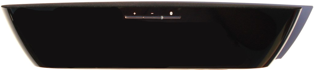 Al desprendernos de todas las protecciones superficiales de la caja acústica, nos damos cuenta de que este aparato es toda una preciosidad. Su diseño alargado curvo, su elegante acabado en negro brillo, su frontal de tela que cubre toda su superficie y acopla perfectamente bordeando todo su contorno, hacen que se pueda colocar en cualquier sitio y quedar perfectamente.