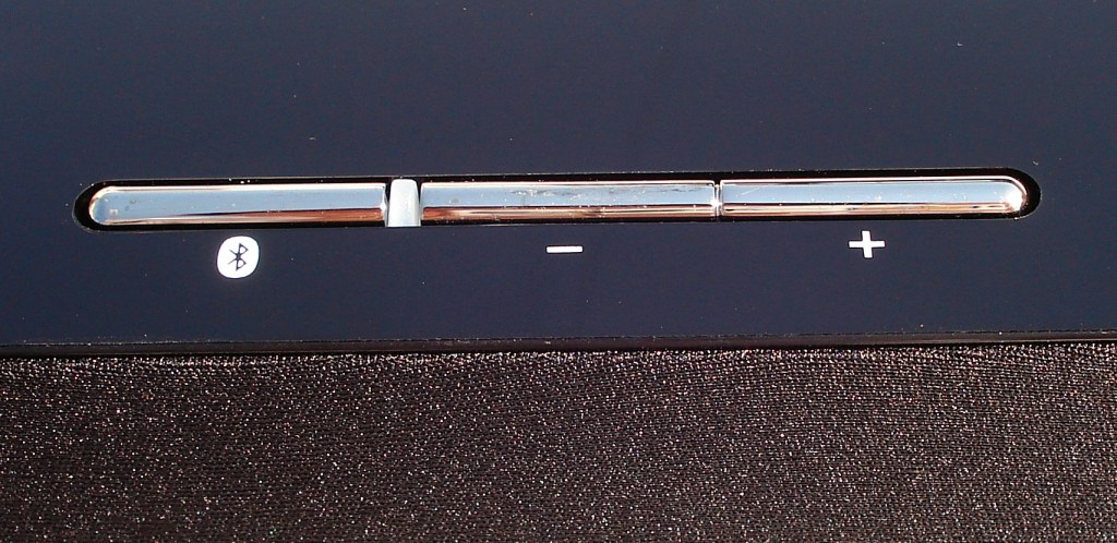 En este panel básicamente tenemos 2 controles. La activación del sensor Bluetooth para interactuar con los dispositivos emisores bluetooth de audio, y 2 botones (- y +) para disminuir o aumentar el volumen. Estos están separados por un LED de color azul que indica la actividad del bluetooth. Para mas información, hace falta leerse el manual de instrucciones.