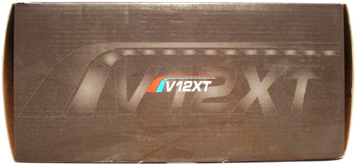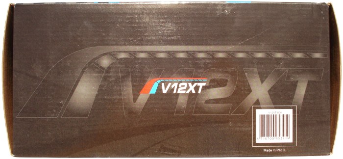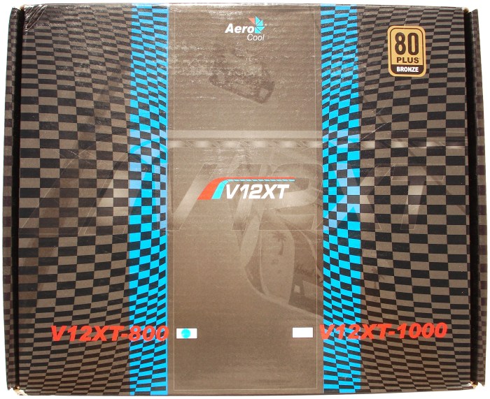 Con un fondo de pista de carreras y con coches disputando un campeonato el fabricante nos quiere proporcionar una idea de competición para su fuente V12XT. Lo más llamativo, a parte del nombre del logo de AEROCOOL y el nombre de la Serie V12XT, es el sello de certificación 80PLUS Bronce, que tan de moda está ahora con el tema de ahorro de energía.