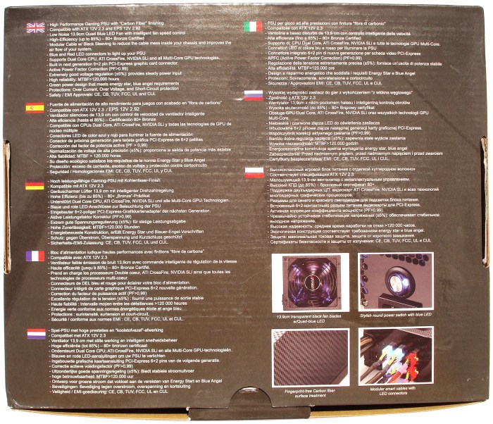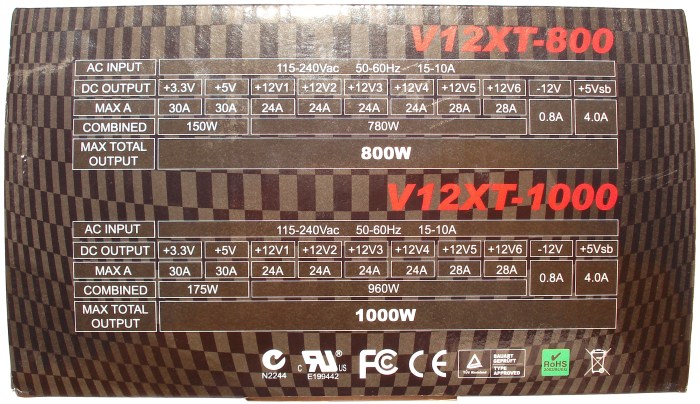 Abajo del todo vemos el nombre de dos modelos V12XT-800 y V12XT-1000, de 800 y 1000W respectivamente, siendo el de 800W el señalado. Esto indica que el fabricante utiliza la misma caja para estos dos modelos, lo que quiere decir que el modelo de 1000W tendrá los mismos accesorios, número de cables modulares (en este caso 2 más que nuestro modelo de 800W), tornillos, etc…