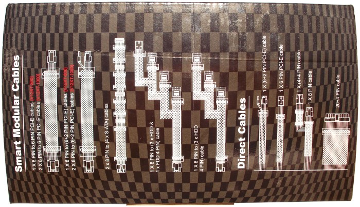 Por último, en este lateral vemos un esquema de todos los cables que vamos a disponer tanto si son modulares como los directos. Hubiera sido muy acertado también añadir la longitud de cada tramo de cada cable. Este esquema del cableado es válido para los modelos de 800 y 1000W, poseyendo 2 cables más el modelo de 1000W destinados directamente a la alimentación de tarjetas gráficas, con conectores de 6 Pines y 6+2 Pines cada cable.