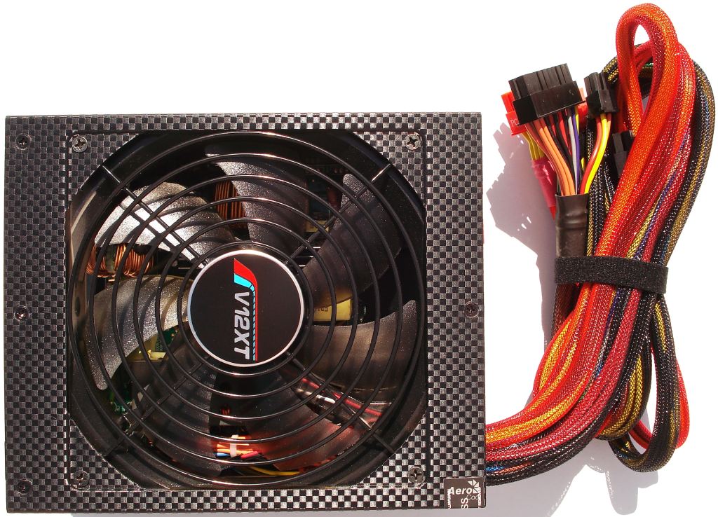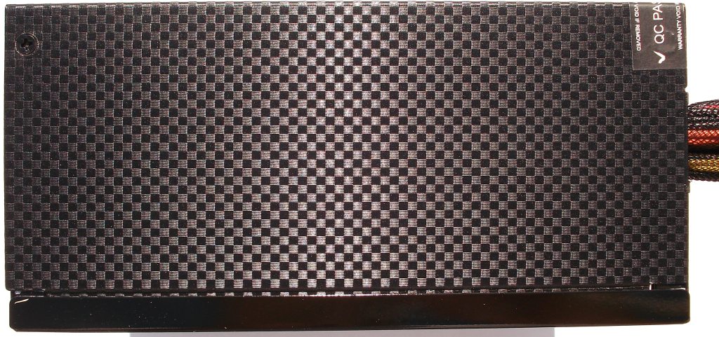 El ventilador es de 13.5cm x 13.5cm con aspas semitransparentes de color marrón-grisáceo. Posee 4 leds azules. Para protegerlo se dispone una rejilla metálica circular pintada en negro, armada por la parte interior, entre la chapa y el propio ventilador. Tal y como veremos en varias fotografías, el acabado externo de esta fuente es exquisito. Se simula radicalidad con su emulación al material de fibra de carbono configurada con pequeños recuadros, que nos recuerda a los coches de carreras. Entre los recuadros oscuros y más claros se genera un contraste algo brillo muy atractivo. Sin duda el acabado de esta fuente es excepcional.