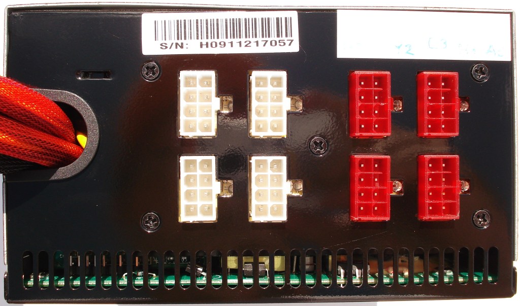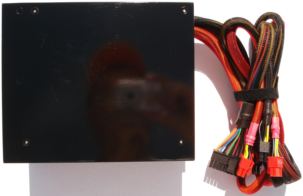 Esta otra cara es idéntica a la anterior salvo por 2 cosas. Posee la pegatina de las especificaciones técnicas de este modelo de 800W, ya descritas en la página 2. Además solo dispone de un único tornillo de refuerzo. Se nota que su interior no es simétrico, no hace falta ni desmontarlo para saber esto.