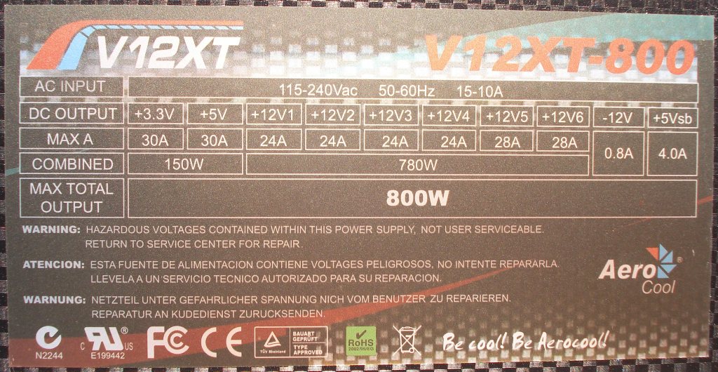 AEROCOOL V12XT-800. Pegatina de Especificaciones Técnicas