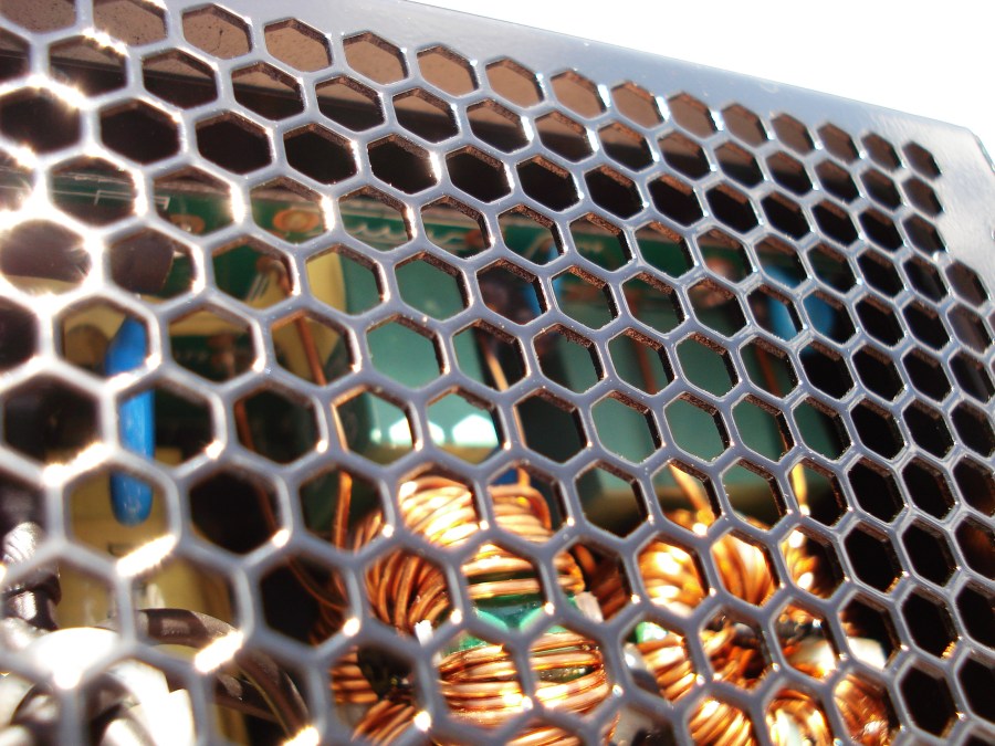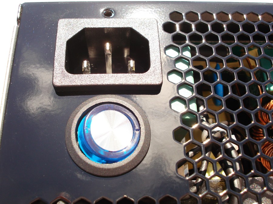 El panel de refrigeración trasero es bastante resistente y con una superficie bastante elevada perforada de la cara delantera. Se refuerza bastante alrededor del conector e interruptor simplemente por no estar perforado.
