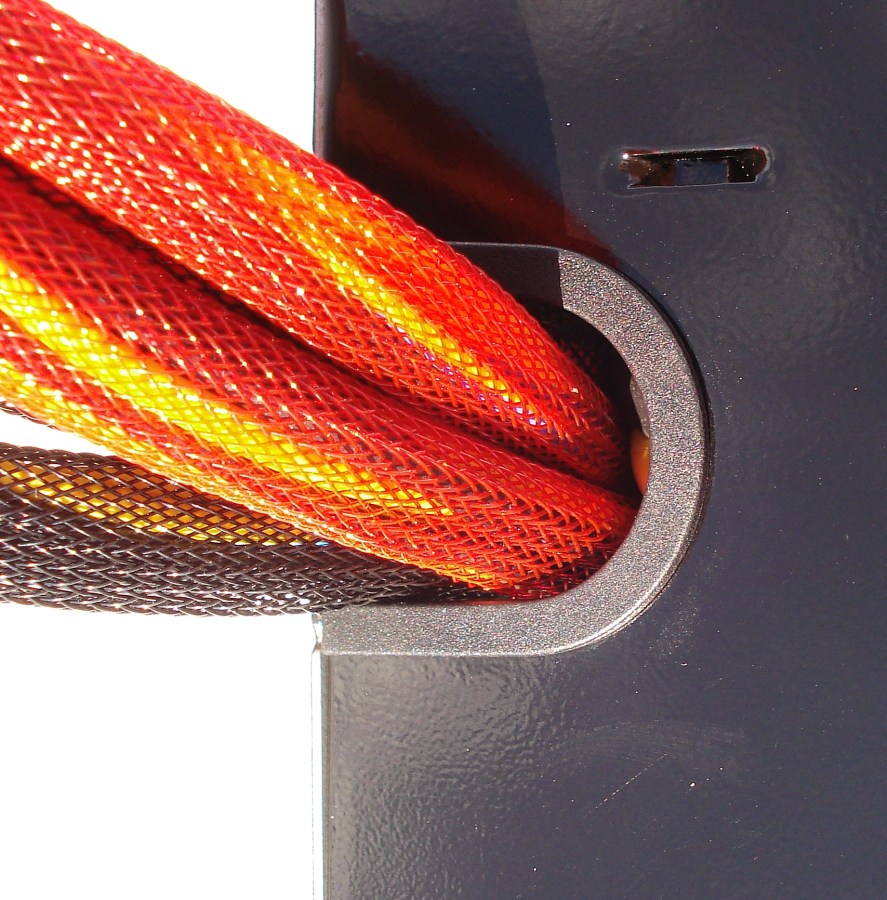El enmallado del cableado directo está prolongado hasta el interior de la fuente, sujeto por unas bridas. En los 360º el cableado está muy bien protegido. Resulta imposible que se haga algún corte a ninguno de los cables por rozamiento. Otro detalle a tener en cuenta. El enmallado es de calidad e ignífugo. Está enfundado hasta los extremos de cada cableado, garantizando así la protección de los mismos.