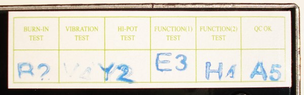 Esta es la pegatina de control donde se especifican los tests llevados a cabo para aprobar el uso de esta fuente de alimentación. Los tests realizados son: