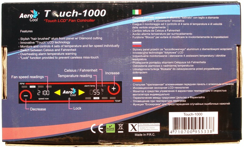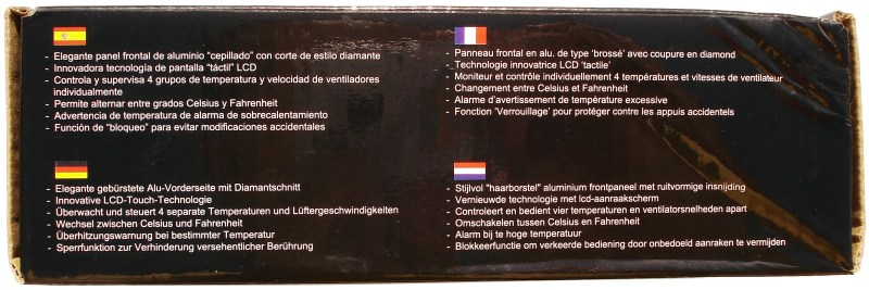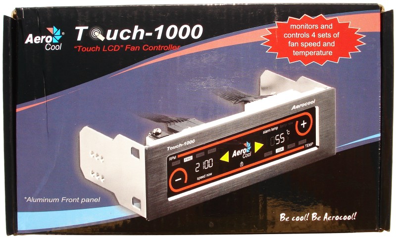 Como siempre, las presentaciones de AEROCOOL para mostrarnos sus productos son bastante llamativas y claras. En la línea superior se destaca la marca y modelo del producto, destacando la frase «Touch LCD» Fan Controller, indicando que posee una pantalla táctil. Así que empezamos por destacar esta característica que distancia de muchos paneles frontales controladores de ventiladores. A su vez, se destaca el material de acabado del frontal, en aluminio, así como las principales funciones del aparato: controlador de 4 ventiladores y 4 sensores de temperatura. Como motivo principal de la vista superior de la caja tenemos, como no podía ser de otro modo, una perspectiva destacando el frontal del TOUCH-1000.