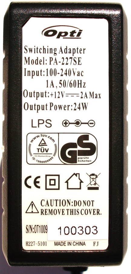 En el lomo del transformador de marca OPTI, modelo PA-227SE, podemos apreciar todos estos datos. Fabricado para el consumo en el hogar, con doble protección y con marcado CE entre otras certificaciones. Tiene una salida de 12V, a 2A y a 24W.