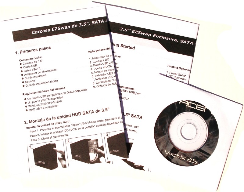 El producto viene acompañado con dos manuales de instrucciones, en inglés y en español, que nos indican cómo conectar y desconectar la unidad de nuestro PC, y cómo armar o expulsar el disco duro en su interior. Además poseeremos un cd de instalación con drivers para Mac y una utilidad para realizar copias de seguridad para Windows, llamada «One Touch Backup». Esta utilidad solo está disponible en chino e inglés.
