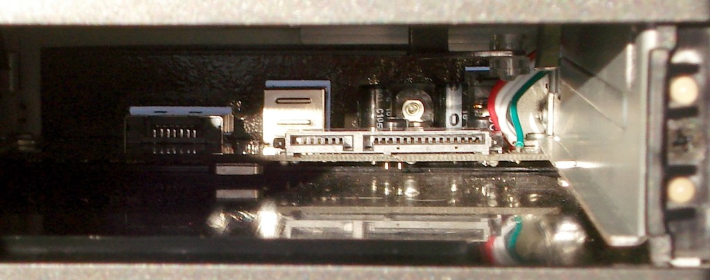 Abriendo la tapa podemos observar su interior. Tiene un raíl de metal que funciona como eje para dirigir el disco duro frente a los conectores de alimentación y de datos de la circuitería interior. Solo es compatible con unidades de discos duros de 3.5″.