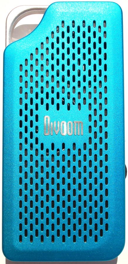 Este dipositivo es bastante sencillo. Posee una batería interna recargable, un pequeño amplificador estéreo, capaz de ofrecer hasta 2’4W RMS continuos y dos pequeños altavoces circulares que se adivinan si nos fijamos a través de las perforaciones. En la fotografía superior podemos ver bien dónde se engancha el mosquetón. Es un anillo metálico bien sujeto a todo el cuerpo. La tapa superior es de aluminio de color azul, también disponible en otros colores.
