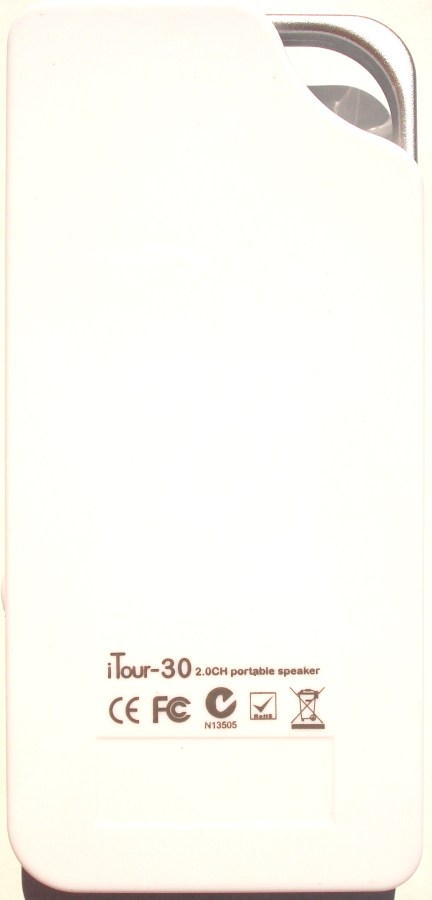 En cambio, todo el dispositivo es de plástico de color blanco. En la parte trasera tenemos serigrafiado el nombre del modelo «iTour-30» y que dispone de 2 altavoces. Posee el marcado CE, cumple con RoHS además de otras especificaciones…
