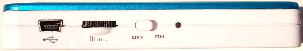 Aquí podemos observar hasta 5 elementos. El primero está en la parte inferior y es el conector hembra tipo jack de 3’5mm. El resto se encuentra en el lado lateral derecho: un led de indicación, un interruptor con dos posiciones y una toma para USB. Luego veremos cada uno por separado…