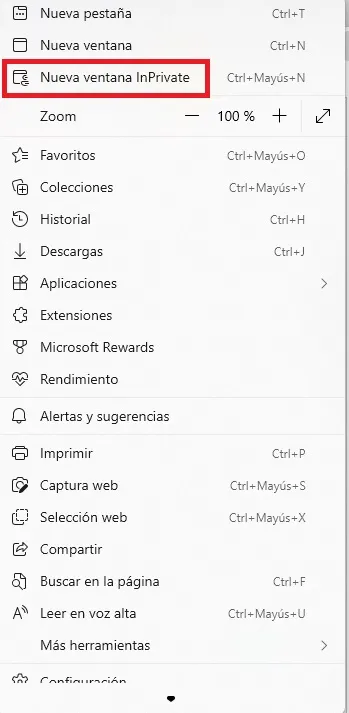 - Se despliega un nuevo menú y entre todas las opciones, la que nos interesa es la que dice Nueva ventana InPrivate.