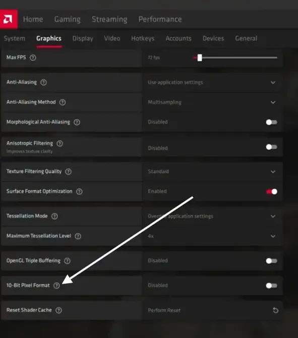 Por otro lado, podemos ver que AMD hace tiempo actualizó las aplicaciones OpenGL debido a que son conscientes de que 10 bits ya no son compatibles con las capacidades de visualización HDR, esto sucede a partir de la versión 22.8.1. La manera de solucionar este problema es desactivar la configuración de formato de píxel de 10 bits para tarjetas gráficas AMD. Para esto abriremos la configuración de AMD y nos dirigiremos a Gráficos > Avanzado y desactivaremos el formato de píxel de 10 bits. Luego de esto debería ser posible activar HDR.