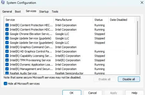 - A continuación, vamos a tener que dirigirnos a Servicios, marcaremos la casilla que dice Ocultar todos los servicios de Microsoft, pulsamos en Deshabilitar todo y daremos clic en Aplicar para que los cambios se guarden.