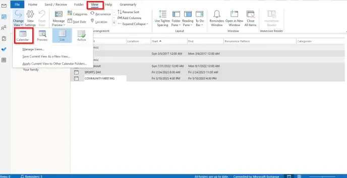 Nuevamente, a la izquierda, veremos que tenemos dos calendarios, vamos a tener que desmarcar el que no tiene evento para fusionarlos. Damos clic en la pestaña “Ver”, luego en “Cambiar vista” y elegiremos la opción “Lista”. Otra vez a la izquierda, elegiremos el calendario, en esta ocasión que si tiene eventos.
