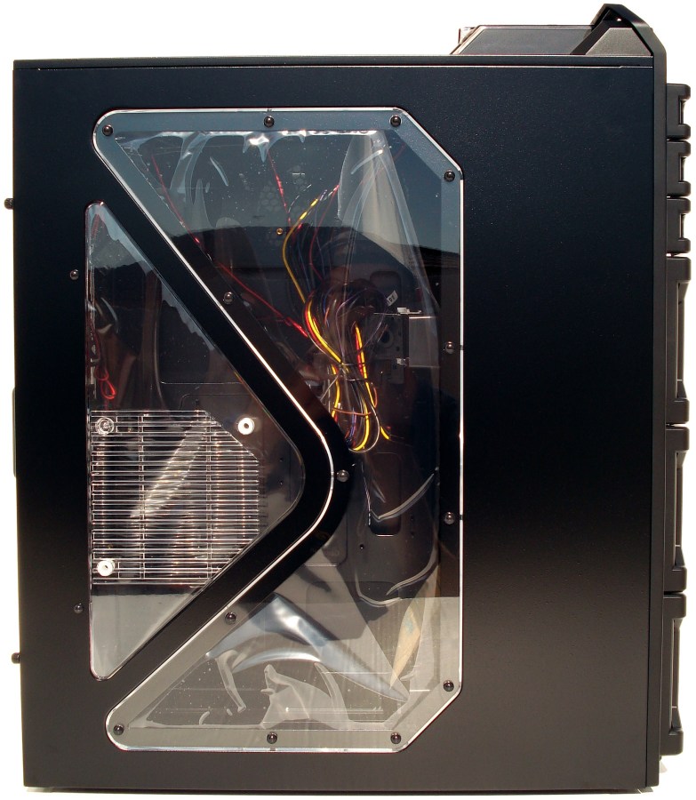 Este lateral puede ser justamente este caso. La torre viene equipada con nada menos que 7 ventiladores (3 de ellos de entrada y filtrados) y solo tenemos 1 opcional, justamente el del lateral izquierdo, en el ventanal. Este no posee filtro antipolvo, siendo una pena que no lo incluya. Además, el ventilador opcional, se quedará a prácticamente 1cm de la superficie interior plana de la ventana, siendo el diseño de fijación el causante de tal retranqueo. Esto podría impedir alguna configuración de ventilación deseada para las tarjetas gráficas instaladas, con disipadores pasivos o activos de grandes dimensiones. Si no entran, no se instala el ventilador opcional y ya está (siendo esto un caso muy excepcional ya que la torre posee una anchura interna muy considerable), pero es una pena que en general no se optimice de una vez por todas la entrada de aire limpio del lateral izquierdo, tal y como se diseñó correctamente por ejemplo, la Nine Hundred Two de ANTEC.