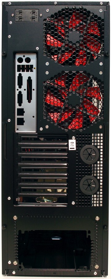 La parte trasera no deja de sorprendernos también. Posee 2 ventiladores de 12cm para extracción de aire en la parte superior, siendo la instalación de la fuente de alimentación en la parte inferior. Otro panel de regulación para 4 ventiladores. Un apartado reservado para la refrigeración líquida (RL) a la altura de los slots PCI y un adaptador para fuentes de alimentación de formato ATX o de la Sere CP exclusivas de ANTEC.
