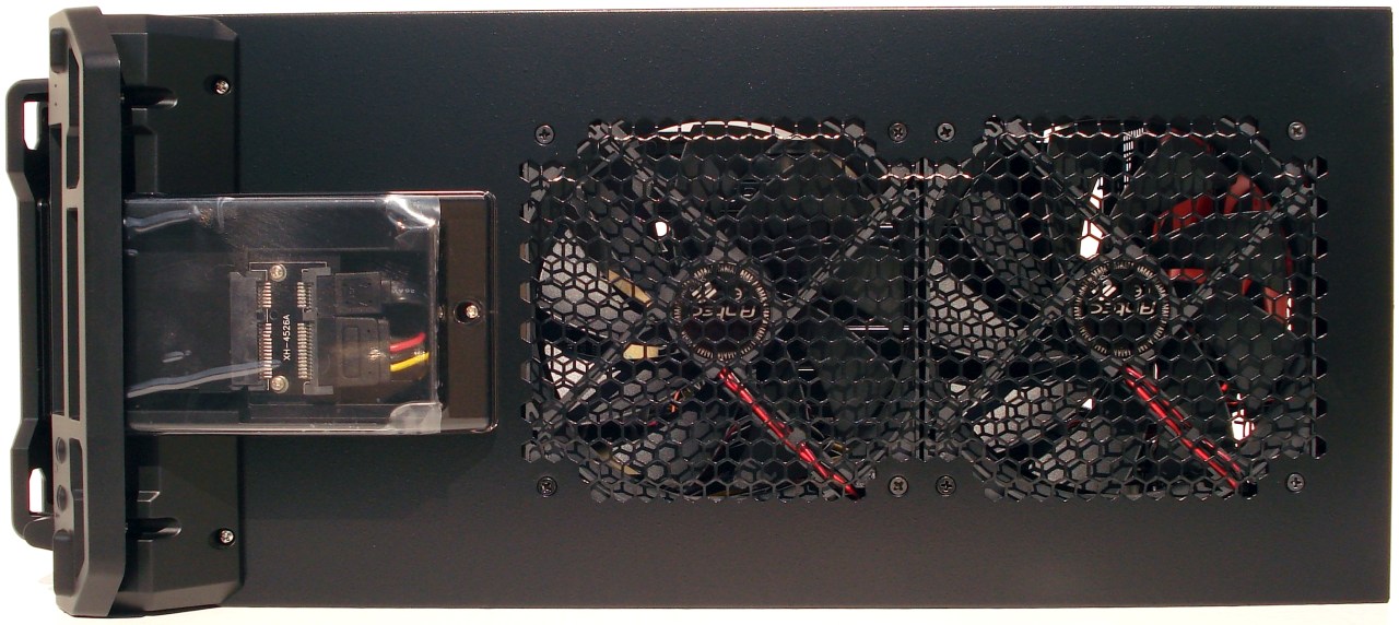 El lomo también tiene su atractivo. En la parte delantera se asoma la corona del diseño frontal, y recorriendo el lomo tenemos la bandeja para unidades SSD y 2 ventiladores de 14cm de extracción de aire, ambos totalmente centrados.