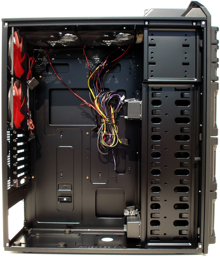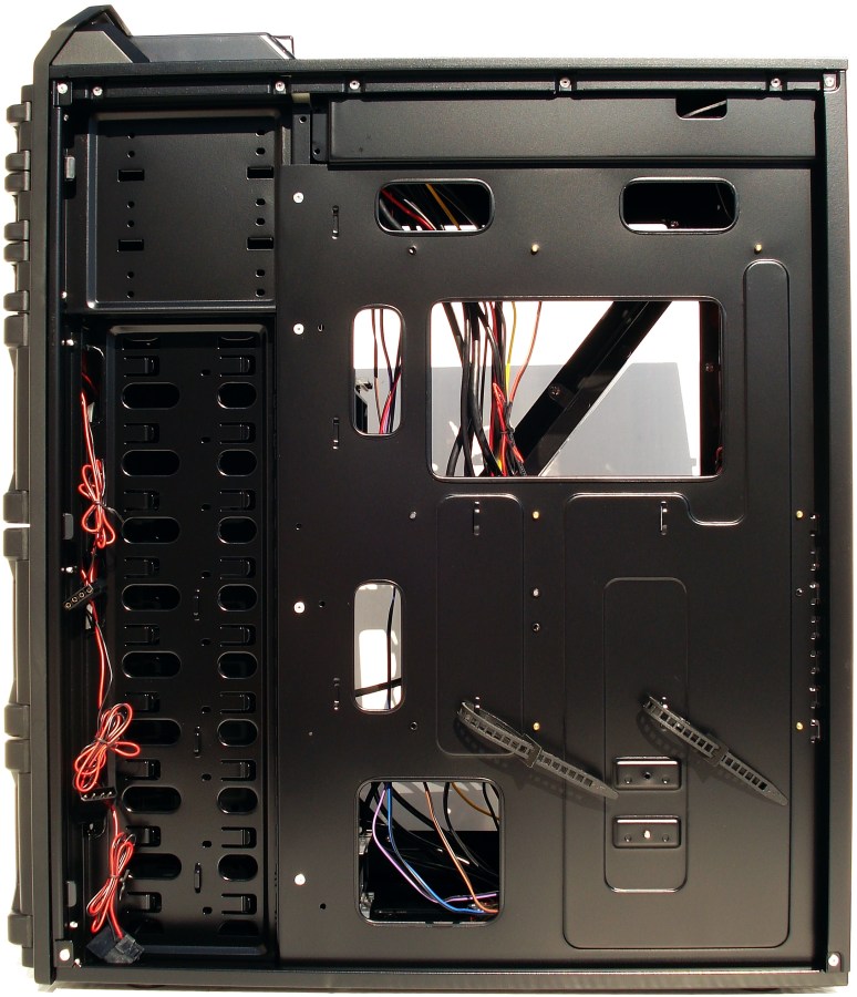 Además, en el lado interior derecho, justo al lado de la zona de las bahías y recorriéndola totalmente en altura, nos encontramos con un excelente hueco para almacenar ahí el cableado que abulte. Sería del todo acertado por parte de los fabricantes (este caso inclusive), que toda la maraña del cableado naciese en esta zona lateral derecha, y no centralmente desde el inferior del lomo, y de ahí ir repartiendo el cableado. De este modo se aseguraría la mayor ocultación del mismo.