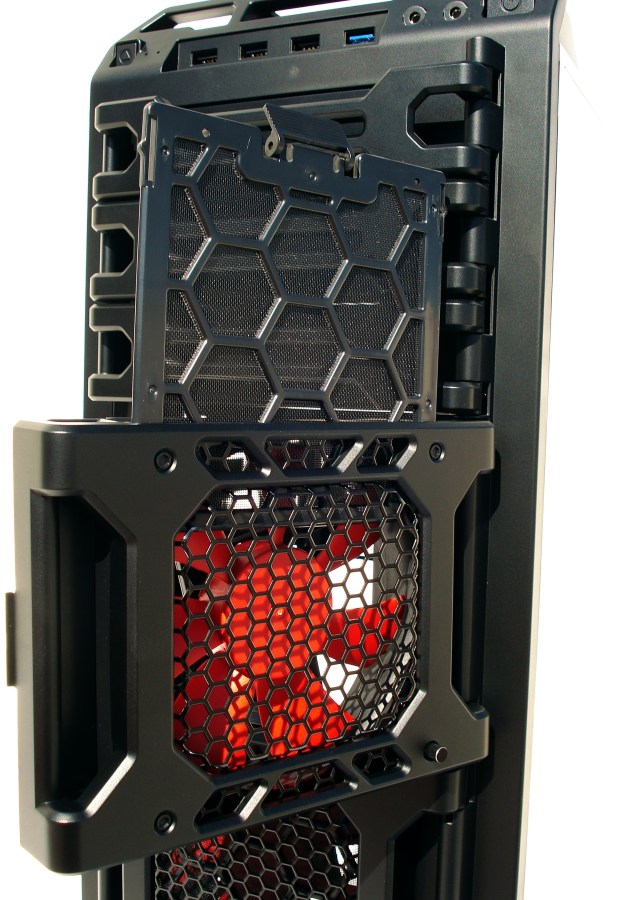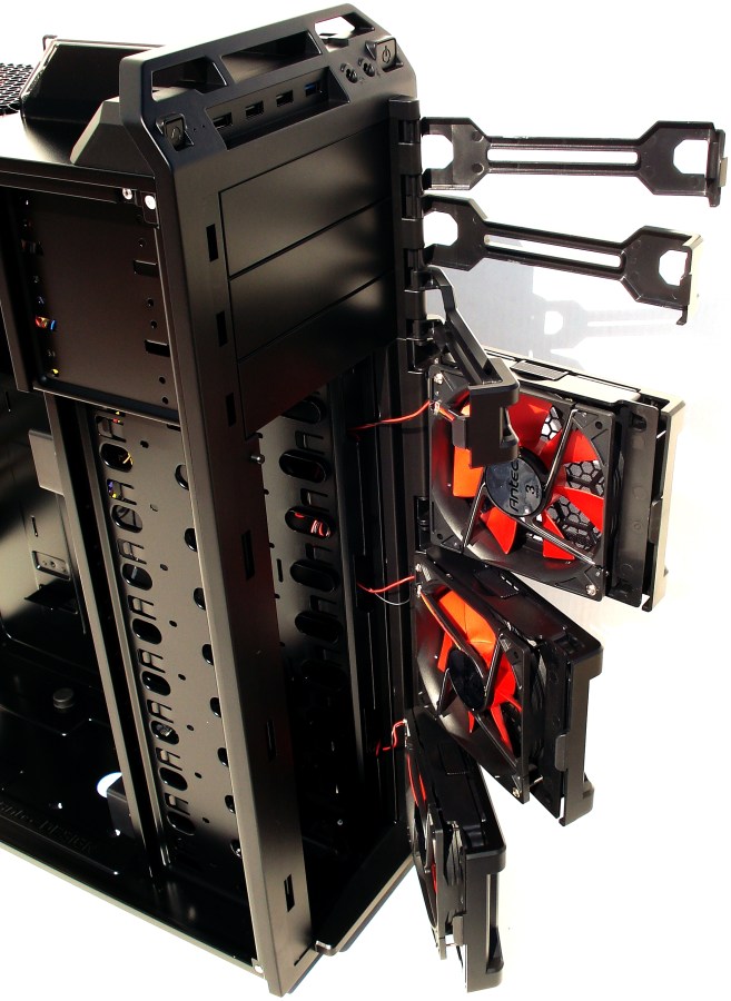 El ventilador viene fijado por 2 tornillos en diagonal, sin ningún sistema antivibraciones, aunque la propia puerta abatible actúa de alguna manera como tal. El filtro antipolvo se abate hacia arriba, y tiene una pestaña abatible y encajable para su fácil extracción. A cada uno de los ventiladores frontales le corresponde un potenciómetro de pequeño diámetro, de buena calidad y fácil de manejar. Gracias a ellos podemos olvidarnos de regular estos ventiladores con un rheobus externo.