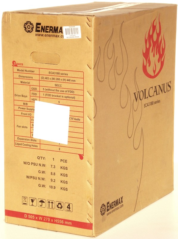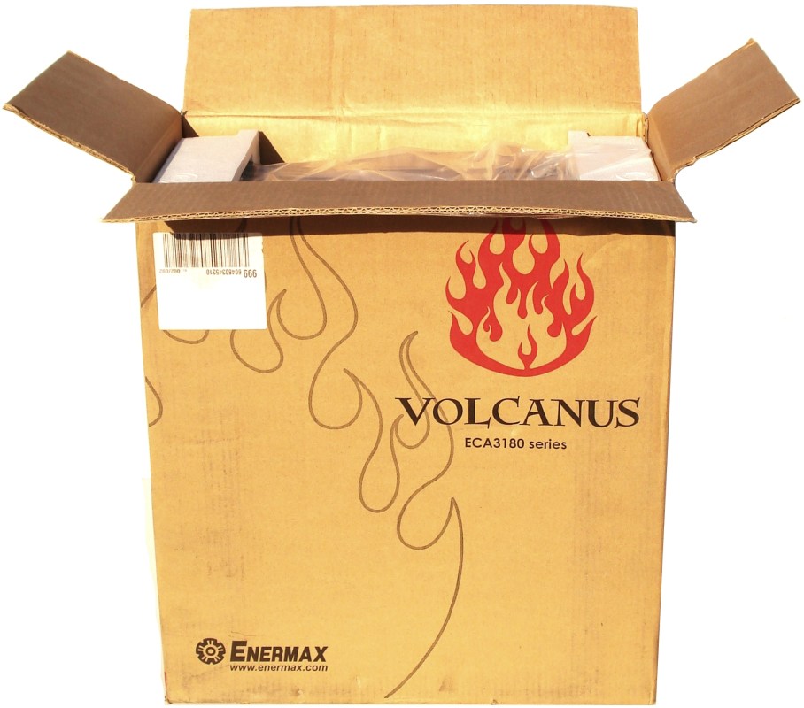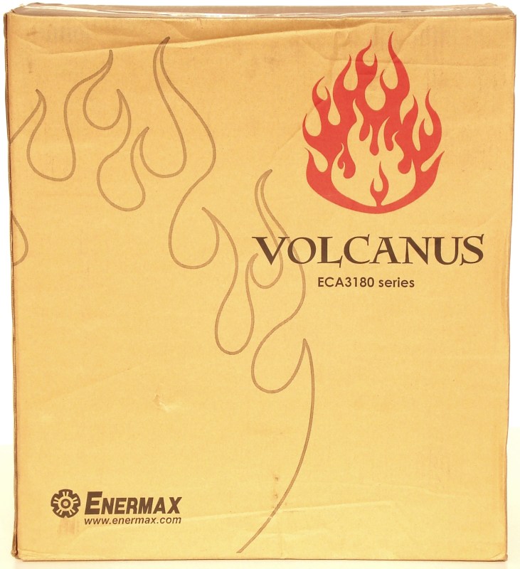 En esta vista lo que más llama la atención es el motivo de una llama viva ardiendo que le da un toque de agresividad. Podemos ya ver el nombre VOLCANUS y modelo del producto ECA3180, así como la marca ENERMAX y la dirección de su página web www.enermax.com.