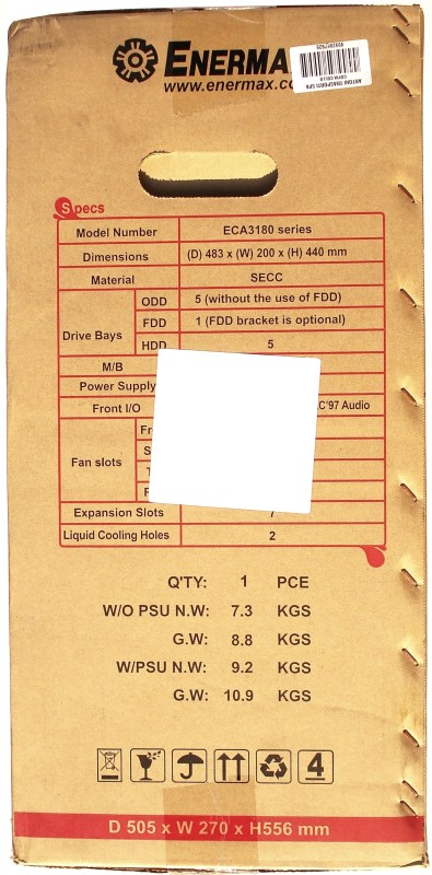 En este lateral venos sus especificaciones técnicas más relevantes, ya nombradas en la página 2. Lo que más destacamos de sus especificaciones es el tipo de material empleado, metal tipo SECC y su peso de 7’3kg. Luego lo veremos detalladamente. La caja de transporte cumple con las medidas de seguridad para tal fin, es impermeable, reciclable, no contaminante, etc.